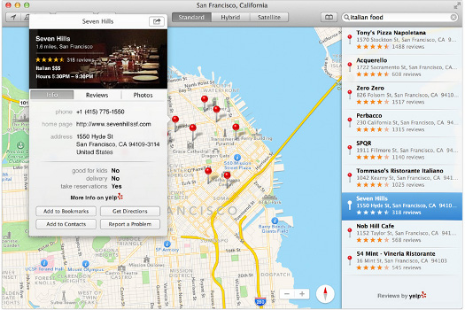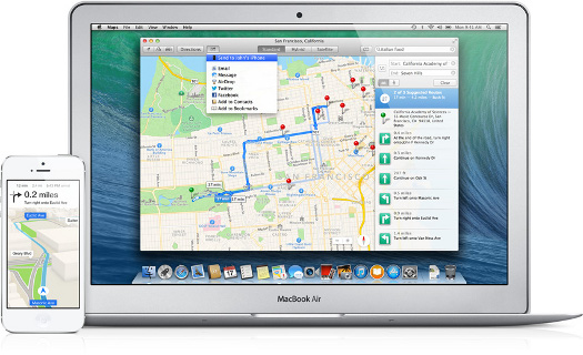 OS X Mavericks’te göze çarpan diğer bir yenilik de haritalar uygulaması. Apple’ın iOS’li cihazlarında kullandığı haritalar servisine bundan böyle Mac kullanıcıları da sahip olacak. Artık iOS’li cihazlar üzerinden yapılan harita işlemleri Mac bilgisayarlar üzerinden de kolay bir şekilde yapılabilecek. Gitmek istediğiniz noktayı OS X Mavericks’te yer alan haritalar uygulaması üzerinden belirttikten sonra bu işlemi hızlı bir şekilde tek bir tuşa basarak iPhone’nunuza gönderebileceksiniz. Böylece gitmek istediğiniz nokta hem iPhone’nunuzda hem de Mac bilgisayarınızda olacak. Mekanların da haritalar uygulaması üzerinden sık kullanılanlara ekleyebileceğinizi de söyleyelim. iOS işletim sisteminde olduğu gibi OS X Maverickts’te FlyOver (Kuş Bakışı) özelliğini sayesinde belirli bölgelerde üç boyutlu binaları görüntüleyebileceğinizi de belirtelim. Ayrıca yine belirli bölgelerde trafik bilgileri de OS X Mavericks üzerinden sizlere sunuluyor.