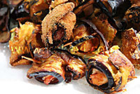 Malzemeler 4 adet tercihen irice patlıcan 500gr. kuşbaşı tavuk göğsü 2 yemek kaşığı sıvıyağ 2 su bardağı süt 1 su bardağı mısır unu 1 silme yemek kaşığı tuz 1 silme tatlı kaşığı karabiber Yeterince kürdan Kızartmak için sıvıyağ