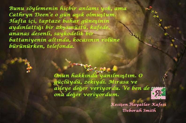 Bir Başka Mavi - Amy Harmon "“Bir varmış bir yokmuş. Yuvasından atılmış, istenmeyen küçük bir karatavuk varmış. Terk edilmiş. Sonra bir şahin onu bulmuş ve onu kapıp uzaklara taşımış. Onu yuvasına almış; uçmayı öğretmiş. Ama bir gün şahin eve gelmemiş ve küçük kuş tekrar yalnız kalmış, tekrar istenmeyen olmuş. Uzaklara uçmak istemiş.” Alçak bir sesle, "Yaşlı adam ne dedi?" diye sordum."Merak etmememi söyledi. 'Kadınlar ağlarlar. Eğer senin yüzünden ağlıyorsa seni hâlâ seviyor demektir dedi."