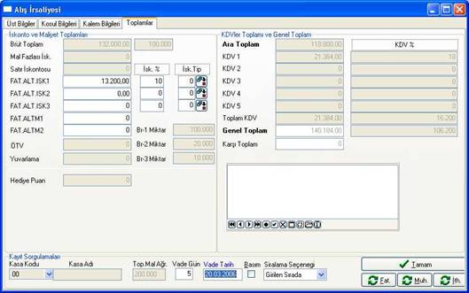 Yukarıda anlatılan iskontolar toplamının brüt toplamdan düşülüp, ek maliyet toplamlarının eklenmesiyle oluşan toplamdır. İlgili sahalarda istenilen düzenlemeler yapıldıktan sonra program tarafından oluşturulacaktır. Müdahale edilemez. Bilgilendirmek açısından görüntülenir.