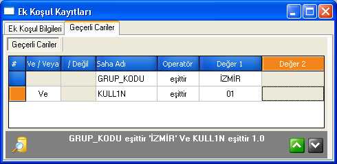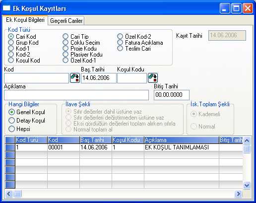 Ek Koşul Kayıtları Ek Koşul Bilgileri Ve Geçerli Cariler olmak üzere iki bölümden oluşmaktadır.