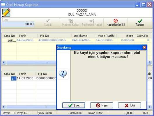 Yapılan kapatma işleminin iptal edilmesi için ilgili cari hareketin üzeri fare ile çift tıklandıktan sonra sil tuşuna basılmalıdır. Böylece kapatma işlemi geri alınacaktır.