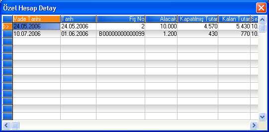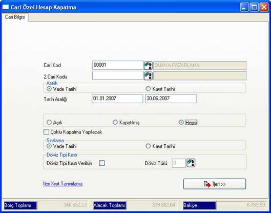 Özel Hesap Kapatma ekranı ile cari hesaba kayıtlar vadelere bölünerek bile atılsa, özel hesap kapatma yapabilmektedir.