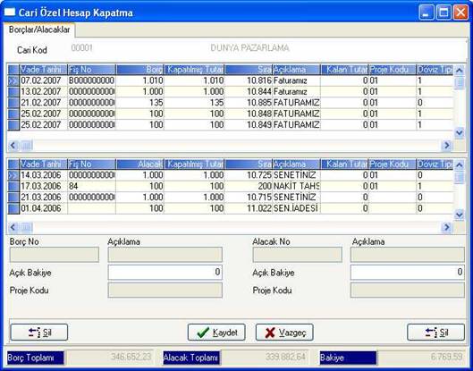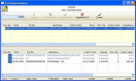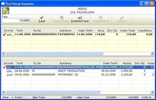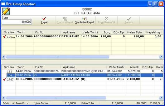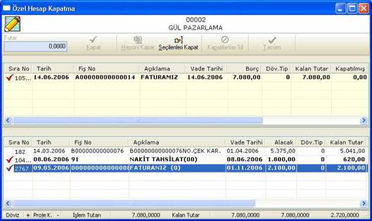 Özel hesap kapatma ekranında üst tarafta borç, alt tarafta alacak hareketleri yer almaktadır. Burada hangi borç hareketi ile hangi alacak hareketinin kapatılacağı seçilir (veya tam tersi).