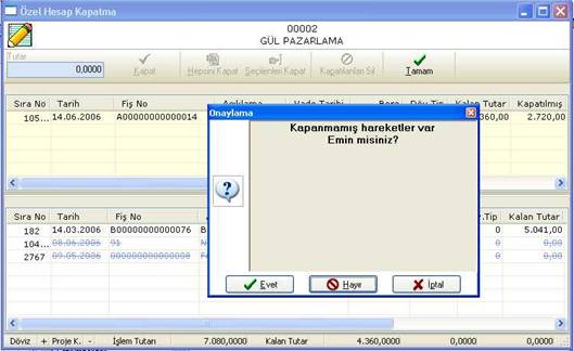 Özel hesap kapatma ekranında daha önceden yapılmış olan kapatma kayıtları silinmek istendiğinde kullanılacak tuştur. Bunun için öncelikle üst taraftan kapatması silinecek hareket tıklanmalı, daha sonra Kapatılanları Sil tuşuna basılmalıdır. Bu durumda program aşağıda görüldüğü gibi bir uyarı verecek ve onaylama sonucunda kapatılmış tutarlar silinecektir.