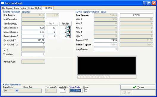 Yukarıda anlatılan iskontolar toplamının brüt toplamdan düşülüp, ek maliyet toplamlarının eklenmesiyle oluşan toplamdır. İlgili sahalarda istenilen düzenlemeler yapıldıktan sonra program tarafından oluşturulacaktır. Müdahale edilemez. Bilgilendirmek açısından görüntülenir.