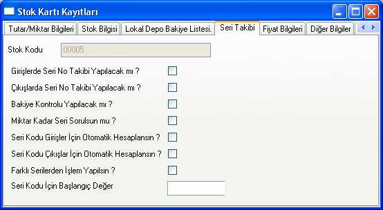 Stok/Kayıt/Seri Parametre Kayıtları bölümündeki, aynı isimli parametre işaretli değil ise stok kartlarında sorgulanan bu parametrenin işlevi yoktur. Seri Parametre Kayıtlarında bu parametre işaretli ise bazı kartlarda otomatik hesaplama yapılabileceği gibi, bazılarında bu parametre işaretlenmeyerek elle seri girişi yapmak mümkündür.
